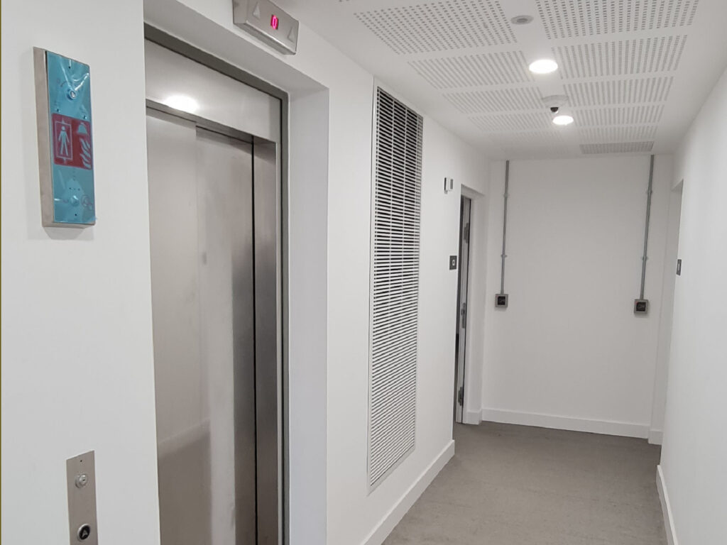 Installed three MRL Lifts using our iKONIC Heavy Duty Fire with a speed of 1.6m/s. We included BS-EN 71 (cat 1 anti-vandal). BS-EN 72 (firefighter regulations) which were fully met. The lifts featured a linen finish and Bronzed door sills.